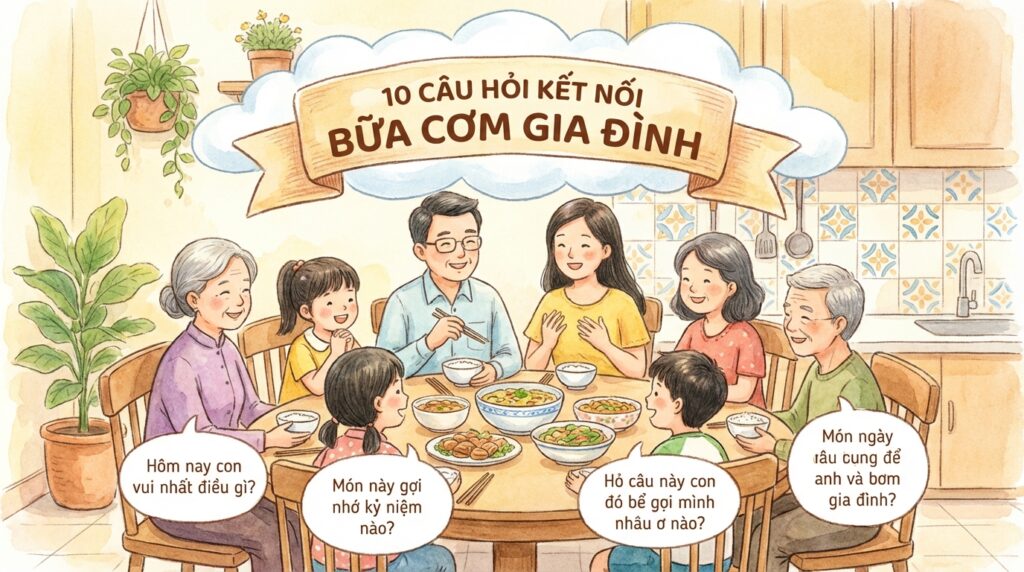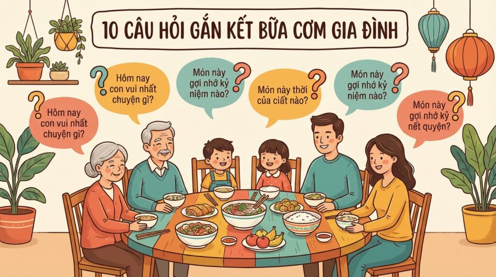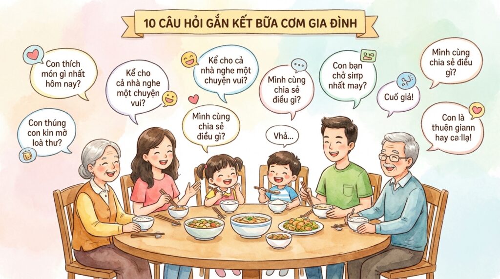 Bữa cơm gia đình không chỉ là lúc trao đổi dinh dưỡng mà còn là “liều thuốc” tinh thần gắn kết cha mẹ và con cái. Áp dụng 10 câu hỏi kết nối đơn giản trên sẽ giúp bố mẹ khai mở những cuộc trò chuyện thân mật, hiểu con hơn và nuôi dưỡng tình yêu thương gia đình bền chặt. Hãy bắt đầu ngay từ hôm nay để mỗi bữa ăn là một hành trình kết nối ấm áp và ý nghĩa. Đừng quên chia sẻ bài viết để mọi gia đình Việt đều có những phút giây hạnh phúc bên mâm cơm thân thương!