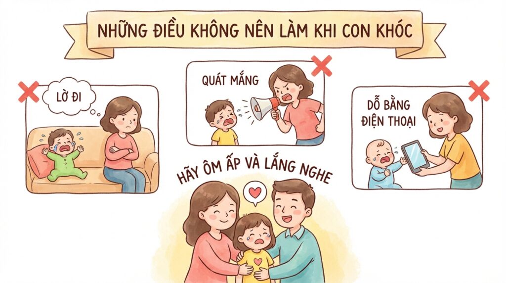Làm gì thay vì: Cho phép trẻ khóc và thể hiện cảm xúc một cách tự nhiên. Hãy ngồi cạnh con, ôm ấp hoặc cầm tay con để trẻ cảm thấy an toàn và được hỗ trợ.