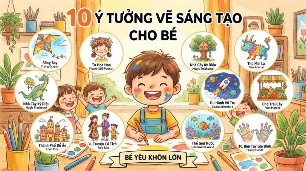 💡 Mẹo Vặt Thực Tế ✨ 10 ý tưởng vẽ sáng tạo cho trẻ 4-12 tuổi dễ áp dụng tại nhà Vẽ tranh là một…